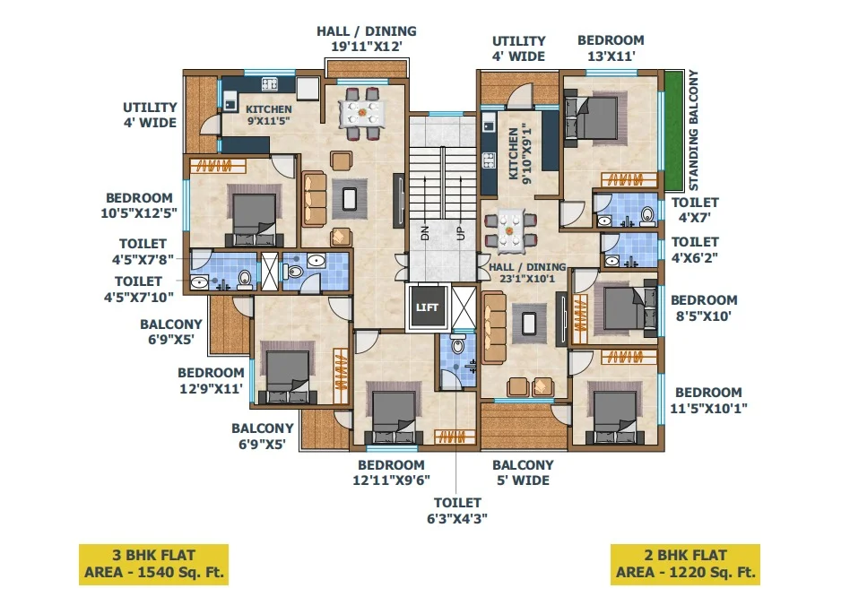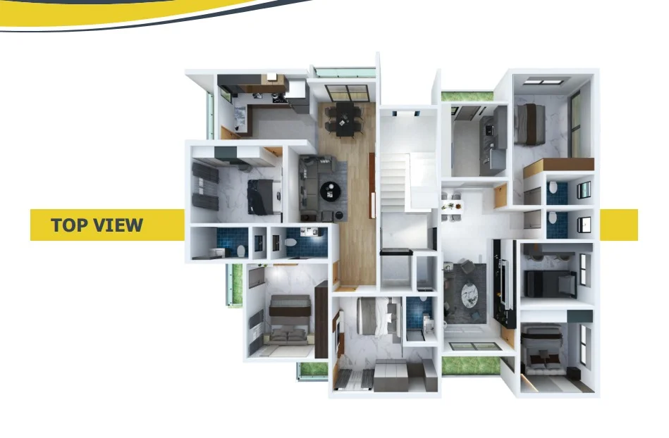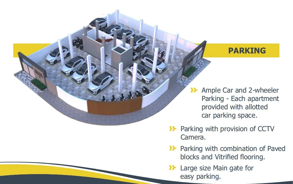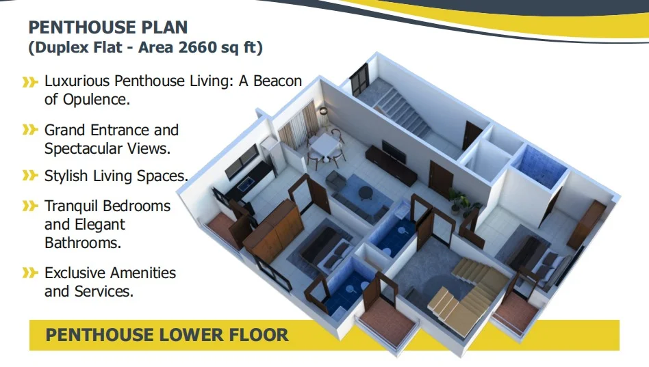 The project features a six-storey residential building with an exclusive duplex penthouse, offering spacious and Vastu-compliant 2 BHK and 3 BHK apartments. Each home is intelligently designed to ensure excellent natural light, cross-ventilation, and privacy, along with functional living spaces, well-sized balconies, and premium interior finishes. From false ceilings with LED lighting to smart electrical fittings and elegant entrance doors, every detail reflects quality craftsmanship and modern lifestyle needs.